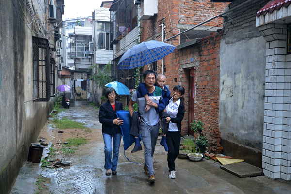 图为曾都区西城办事处草店子社区党委书记刘锦华(右一)与社区干部冒雨送生病的王明全老人去医院。