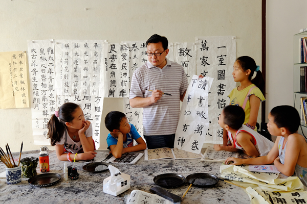 社区普遍建立文化活动室并全天开放。图为曾都区西城办事处双龙寺社区党员、省书法家协会会员王道升义务指导孩子们练习书法。