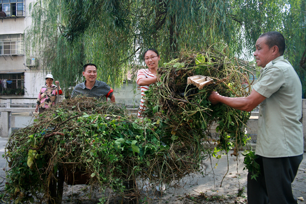 打造“一社一品”为民服务项目。图为曾都区西城办事处玉波门社区党委书记刘振建(左二)帮助居民清扫垃圾。