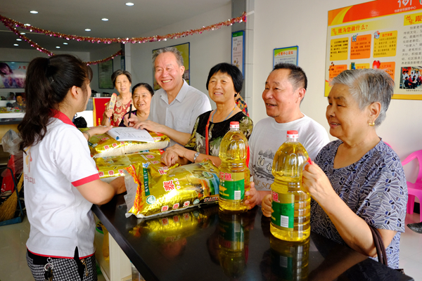 建立“爱心超市”,为城市低保户、特困居民提供油米等生活必需品。图为社区特困居民到“爱心超市”领取生活用品。