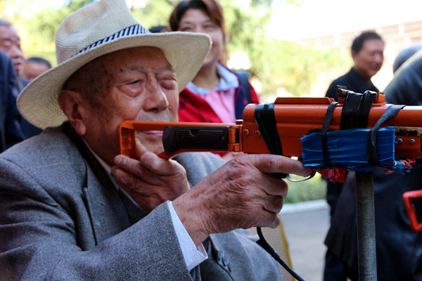 图为84岁高龄离休干部申世杰参加激光射击比赛
